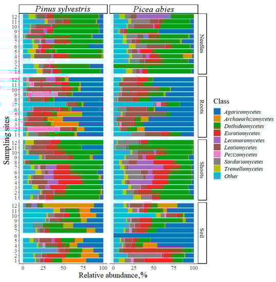 For both P. sylvestris and P. abies, in different study sites and substrates the most abundant fungal phyla were Ascomycota and Basidiomycota, which are known to dominate among fungi colonizing soils and terrestrial plant tissues []. In agreement with other studies, our results demonstrated high ecological importance and wide distribution of these phyla in soils (e.g., Wei et al. []; Zheng et al. []), roots (e.g., Zhao et al. []), needles (e.g., Agan et al. []) and shoots (e.g., Sanz-Ros et al. []). The results also showed the predominant occurrence of fungal classes such as Dothideomycetes, Agaricomycetes, Eurotiomycetes, and Leotiomycetes (Figure 3 and Table 3 and Table 4), which are commonly reported classes from environmental samples [,,]. Dothideomycetes is known to be one of the largest classes within Ascomycota, containing over 19,000 species of saprotrophs, parasites, and occasional lichen-forming species [,,]. Dothideomycetes were reported from different ecosystems, ranging from hot deserts [] to low-temperature environments in Antarctica [,]. Agaricomycetes was the second most-abundant fungal class, representatives of which possess several important ecological functions such as the formation of ectomycorrhizal symbiosis and wood decay in shrubs, perennial plants, and trees [,]. Their activity is essential for ecosystem functioning in different environments including forest soil [,,] or grassland soils []), but also in different tissues of P. sylvestris and P. abies as was shown in the present study. Eurotiomycetes and Leotiomycetes include saprotrophic, biotrophic, lichen-forming fungi, ectomycorrhizal fungi, and endophytes [,], demonstrating their importance in different environments of managed and natural ecosystems.