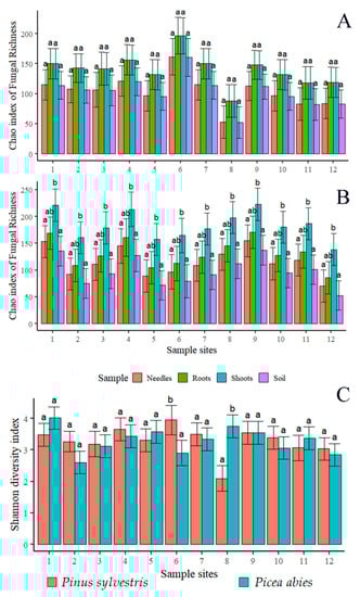 Diversity estimates: Chao1 richness index of fungal communities in different samples (needles, roots, shoots, and the soil) of P. sylvestris (A) and P. abies (B). The Shannon diversity index of fungal communities associated with P. sylvestris and P. abies (C). Sampling sites are as in Figure 1. Only corresponding samples (shown in the same color) were compared with each other. The same letter shows that values did not differ significantly from each other at p > 0.05.