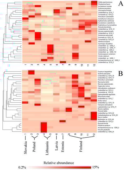 Hierarchical clustering of the 30 most common fungal OTUs associated with each tree species showed differences in their relative abundance at different study sites (Figure 5). The analysis also revealed certain specificity of particular OTUs in different geographical regions. In P. sylvestris, fungal OTUs such as A. luzulae, Tomentella sp. 5210_8 or Coniothyrium olivaceum were more common in the southern part of the gradient, Scoliciosporum umbrinum, Archaeorhizomyces sp. 5208_0 or Unidentified sp. 5210_5 in the central part of the gradient, and Phyllactinia fraxini, Acrodontium crateriforme, or Hyphodiscus hymeniophilus in the northern part of the gradient (Figure 5A). In P. abies, fungal OTUs, such as Fusarium langsethiae, P. camemberti, or Tylospora asterophora, were more common in the southern part of the gradient; Russula firmula, Piloderma lanatum, or Inocybe geophyla in the central part of the gradient; and Helicodendron coniferarum, Suillus luteus, or Rhizoctonia solani in the northern part of the gradient (Figure 5B). Additionally, several OTUs, such as Unidentified sp. 5210_5, Unidentified sp. 5210_19, Unidentified sp. 5210_7, Mycena septentrionalis, and Tomentella sp. 5210_8 were common both in the southern and in the northern part of this gradient (Figure 5B).