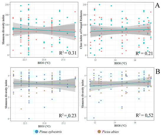 The linear regression model showing the effect of bioclimatic variables on the Chao1 richness index (A) and the Shannon diversity index (B) of fungal communities associated with P. sylvestris and P. abies (p < 0.05). The description of BIO variables is in Table 2.