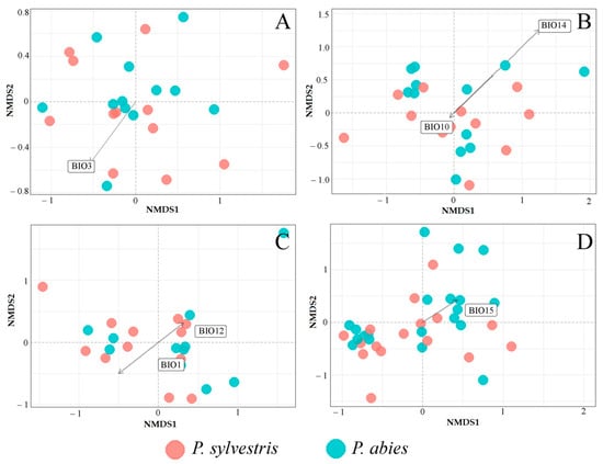 Nonmetric multidimensional scaling (NMDS) plot of fungal communities, based on the Bray–Curtis dissimilarity matrix, derived from Pinus sylvestris and Picea abies samples: (A) needles, (B) shoots, (C) roots, (D) the rhizosphere soil. Vectors show bioclimatic variables, which had a significant effect on fungal community composition (p < 0.05). Bioclimatic variables, which are highly correlated (R > 0.8) among each other, are not shown in the diagram. The description of bioclimatic variables is in Table 2.