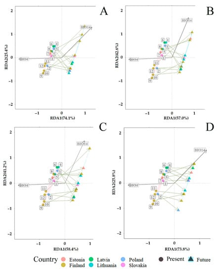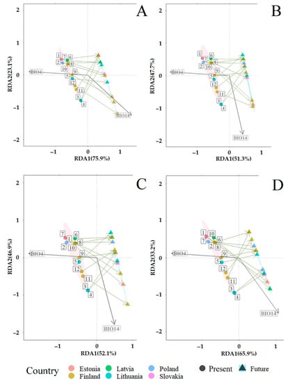 Redundancy analysis (RDA) showing the predicted changes in fungal communities associated with Pinus sylvestris under the CMIP6 [] in different time periods: (A) 2019 vs. 2040; (B) 2019 vs. 2060; (C) 2019 vs. 2080; and (D) 2019 vs. 2100. Present (2019) (pink area): coordinates of sampling sites are shown by circles. The number near each circle indicates the study site: 1 (Slovakia—SK), 2–3 (Poland—PL), 4–5 (Lithuania—LT), 6 (Latvia—LV), 7 (Estonia—EE), 8–12 (Finland—FI), as presented in Figure 1. Future (blue area): expected coordinates of study sites are shown by triangles. The description of BIO parameters is in Table 2.