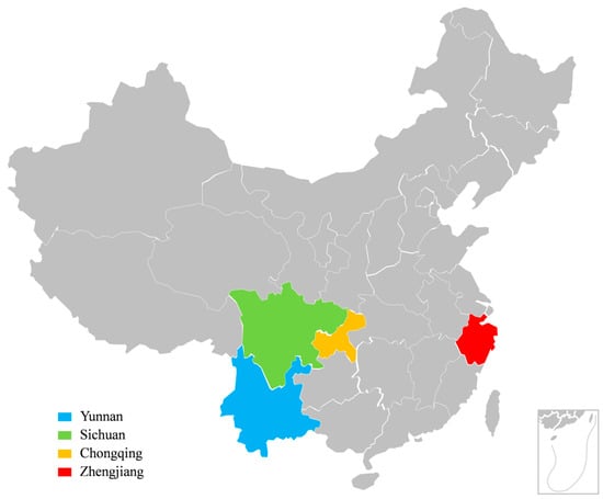 Geographical distributions of Ustilaginoidea virens isolates in Southern China. Yunnan Province, Sichuan Province, Chongqing Municipality, and Zhejiang Province are marked in blue, green, orange, and red, respectively.