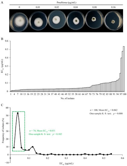 Sensitivity of Ustilaginoidea virens to prochloraz. (A) Sensitivity was determined on PSA plates with 0, 0.01, 0.02, 0.04, 0.08, and 0.16 μg/mL prochloraz. (B) Sensitivity of 100 U. virens isolates to prochloraz. (C) Frequency distribution of EC50 values of 100 U. virens isolates to prochloraz. A one-sample Kolmogorov–Smirnov test was performed by SPSS 19.0. p value < 0.05 means it is not normally distributed, and p value > 0.05 means it is normally distributed.