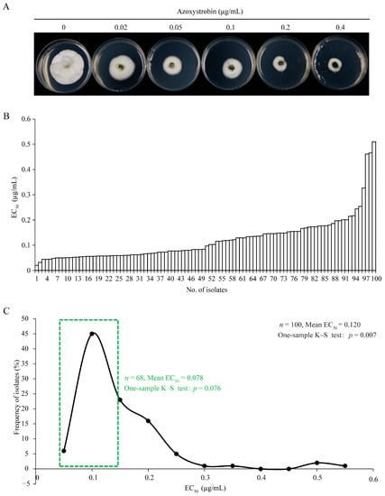 Sensitivity of Ustilaginoidea virens to azoxystrobin. (A) Sensitivity was determined on PSA plates with 0, 0.02, 0.05, 0.1, 0.2, and 0.4 μg/mL azoxystrobin. (B) Sensitivity of 100 U. virens isolates to azoxystrobin. (C) Frequency distribution of EC50 values of 100 U. virens isolates to azoxystrobin. A one-sample Kolmogorov–Smirnov test was performed by SPSS 19.0. p value < 0.05 means it is not normally distributed, and p value > 0.05 means it is normally distributed.