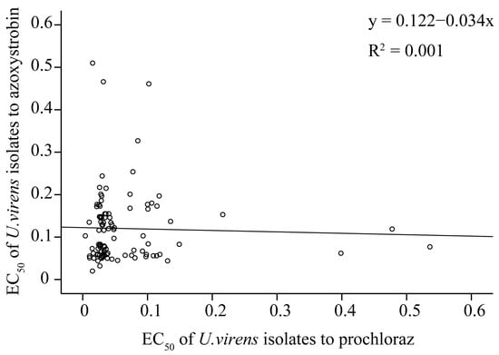 To reveal the correlation between the sensitivity of U. virens to prochloraz and azoxystrobin, a linear regression analysis was performed based on the above EC50 values of 100 U. virens isolates to the fungicides. The results showed that there was no correlation in sensitivity between prochloraz and azoxystrobin (n = 100, R2 = 0.001, y = 0.122 − 0.034x, p = 0.753), suggesting no cross-resistance between them (Figure 4).