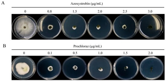 To monitor resistance to prochloraz and azoxystrobin in Yunnan, Sichuan, Chongqing, and Zhejiang in Southern China, 30 randomly selected U. virens isolates were used to determine MIC values by setting a series of mass concentrations of 0, 0.1, 0.5, 1.0, 1.5, and 2.0 μg/mL of prochloraz and 0, 0.8, 1.5, 2.0, 2.5, and 3.0 μg/mL of azoxystrobin. None of the tested isolates grew on PSA plates with 2.0 μg/mL prochloraz or 3.0 μg/mL azoxystrobin (Figure 5). These doses were regarded as threshold values to screen field-resistant isolates.