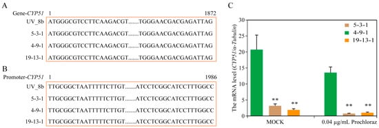 For analyzing the molecular mechanism of resistance to prochloraz, 1986-bp upstream and 1827-bp gene fragments of CYP51 in the field-resistant isolate (5-3-1) and sensitive isolates (4-9-1 and 19-13-1) were amplified and sequenced. The sequence alignments showed that no nucleotide mutation was detected in the promoter or gene regions of CYP51 in 5-3-1, 4-9-1, or 19-13-1 isolates compared with the standard strain UV_8b (Figure 7A,B). Furthermore, the gene expression of CYP51 was performed by qRT-PCR, and the results showed that the gene expression level of CYP51 in 5-3-1 was significantly higher than that of 4-9-1 and 19-13-1, regardless of the use of 0.04 μg/mL of prochloraz or mock treatment. Moreover, the CYP51 expression level of 5-3-1 was eight-fold that of the mean value of 4-9-1 and 19-13-1 with the mock treatment, while the difference increased to sixteen-fold when treated with 0.04 mg/L prochloraz (Figure 7C).