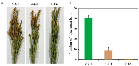 Virulence analysis of three Ustilaginoidea virens isolates, including one field-resistant isolate, 5-3-1, and two field-sensitive isolates, 4-9-1 and 19-13-1. (A) Disease symptoms of rice false smut on rice panicles were observed about one month after inoculation with each isolate. (B) The mean number of false smut balls per panicle a month after inoculation. Data are the means ± standard error.