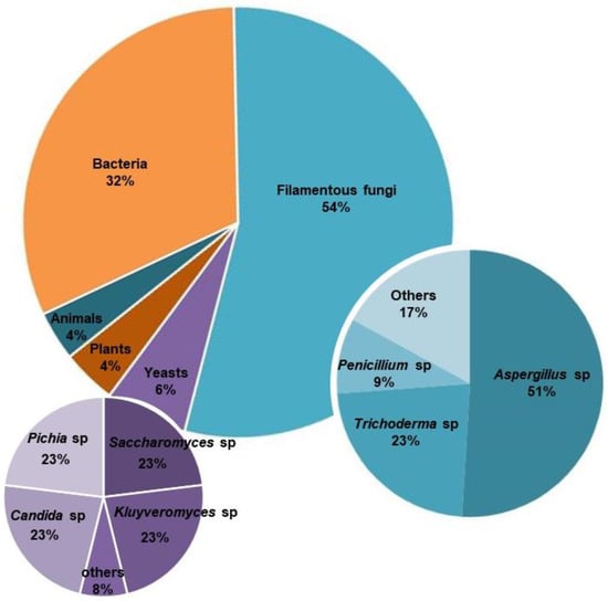 Historically, humanity has practiced rudimentary biotechnology without prior knowledge of the underlying biological mechanisms, e.g., for the production of beer, wine or bread. However, in the last decades, industrial biotechnology has changed drastically. Microorganisms are widely used in large-scale industrial processes as cell factories for the production of a variety of compounds, such as ethanol, organic acids, antibiotics, vitamins, proteins and enzymes [1], which have a wide variety of industrial applications (e.g., food, feed, biofuels, biochemicals, cosmetics, pharmaceuticals, textiles, pulp and paper and construction) [2]. Processes using bacteria, mammals and fungi have been widely used for production at an industrial level. In this review, we will focus on classical and recent methods used for the development of fungal producing strains. Whereas bacteria and yeasts have been accompanied by the development of sophisticated gene expression systems, filamentous fungi lag behind in providing comparable systems [3]. However, filamentous fungi are excellent candidate microbial cell factories. They naturally produce enzymes for the efficient decomposition and conversion of various kinds of biomass [4], especially plant biomass [5], and have a high protein secretion capacity, which is a common feature of their decomposing lifestyle. Fungal-based systems have several advantages over other (e.g., bacterial-based) systems. In addition to their high-level protein secretion capacity, they will be the vehicle of choice for large-scale production of recombinant proteins of eukaryotic origin, due to shared critical processes in gene expression and post-translational modifications with other eukaryotic organisms [6]. Fungi, particularly filamentous fungi, are used as expression hosts for proteins that require elaborate post-translational modification, e.g., protein glycosylation, proteolytic cleavage or multiple disulfide bond formation [7], which are key for the stability and activity of functional proteins. Yeast expression systems, such as Pichia pastoris, can secrete recombinant proteins with high efficiency and purity in many cases [8]. However, the secretory potential of filamentous fungi is reported to be higher than that of yeast strains [9]. In fact, fungal enzymes make up more than half of the enzymes currently used in industrial applications, with Aspergillus, Trichoderma and Penicillium being the most widely used filamentous fungal genera in industry [10] (Figure 1). Additionally, many filamentous fungal production strains have a GRAS (Generally Recognized As Safe) status [11], which is also a great advantage.