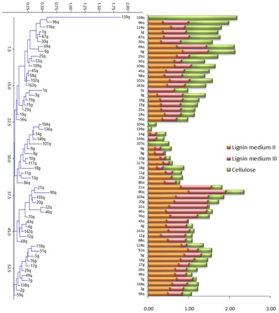 Dendrogram and bar plot representing the clustering of yeast isolates based on their ligninolytic and cellulolytic activities (Lignin medium II = represents the Lgp and Mnp activities present in the isolates and Lignin medium III = represents the Lac activity of the isolates).