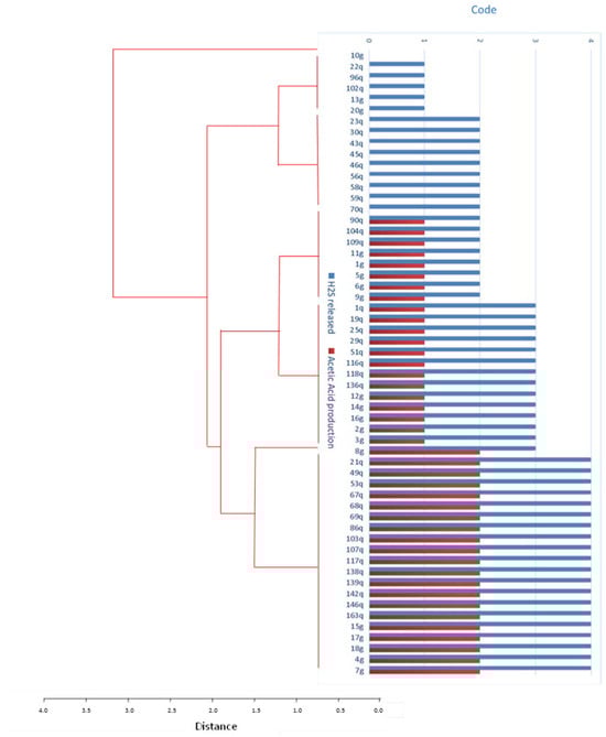 All the isolates produced hydrogen sulfide, except the 10g isolate (Starmerella bacillaris), which did not produce this compound or acetic acid. Indeed, in 26% of the isolates, acetic acid was not detected, and when it was detected, the amount was generally low, with a maximum of two on a scale up to four (Figure 3, Supplementary Table S1, Supplementary Figure S1d,e). Seven yeast clusters were formed by combining the production of acetic acid and hydrogen sulfide, from the total absence of synthesis of both compounds, only observed in 10g, to the detection of high production in both cases (especially for hydrogen sulfide, with a four on a four scale) in 35.1% of the studied yeast isolates.