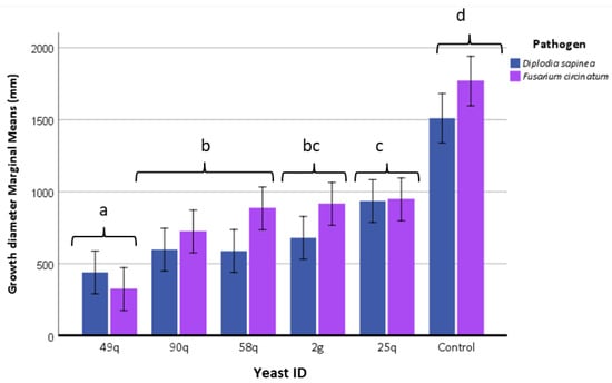 Growth (colony diameter measurement) of pathogens Diplodia sapinea and Fusarium circinatum using the technique of paired cultivation in the presence of five yeast isolates. The growth of these pathogens in the absence of yeast was used as a control. Statistically significant differences (p < 0.05) among treatments are indicated with different lowercase letters. Bars indicate error, 95% confidence intervals.