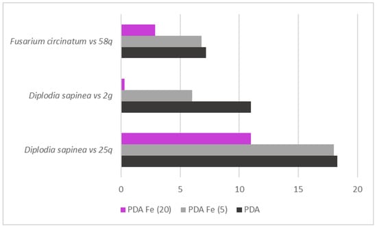 Effect of the iron concentration (5 = 5 µg/mL; 20 = 20 µg/mL) on the reduction in diameter of the pathogenic strains: Diplodia sapinea, in paired cultures with the 2g and 25q isolates, and Fusarium circinatum, in paired cultures with the 58q isolate.