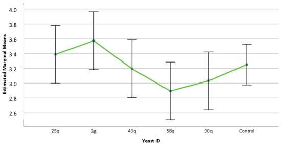 The production of hydrogen sulfide and acetic acid was determined in the 58 yeast isolates. First, 100 µL of yeast cell suspensions (106 cells/mL) were spotted on Biggy Agar (Oxoid, Bakingstoke, UK) and on CaCO3 agar medium (5 g/L yeast extract; 20 g/L glucose; 10 g/L CaCO3; 20 g/L agar) to determine H2S and acetic acid production, respectively. The plates were incubated at 30 °C for 3 days. The qualitative amount of H2S production was determined by the color of the colonies, ranging from white (no release) to black (high release). The codification used was as follows: (0) white (undetected), (1) light brown, (2) brown, (3) dark brown, and (4) black [].