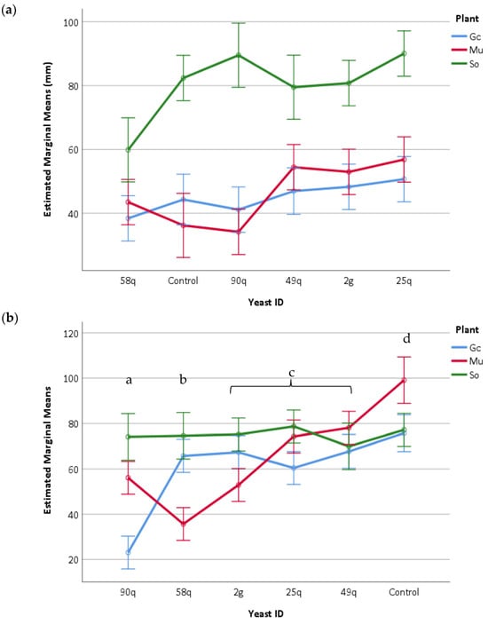 Length (mm) of the aerial part (a) and root system (b) of the plants (Gc = Garden cress, Mu = Mustard, and So = Sorghum) after having been treated with the different yeast suspensions, compared to the control treated with only water. Statistically significant differences (p < 0.05) in the effect of each yeast for the whole set of tested plants are indicated with different lowercase letters. Bars indicate error, 95% confidence intervals.