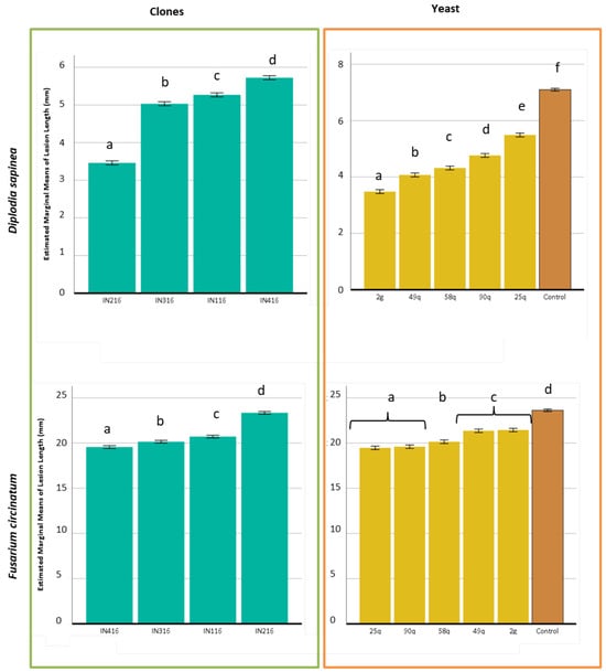 Length of the lesion caused by Diplodia sapinea (above) and Fusarium circinatum (below) in in vivo assays of clonal plants treated with a yeast suspension. Statistically significant differences of p < 0.05 among cuttings (left side) and yeast (right side). These differences are indicated with different lowercase letters. Bars indicate error, 95% confidence intervals.