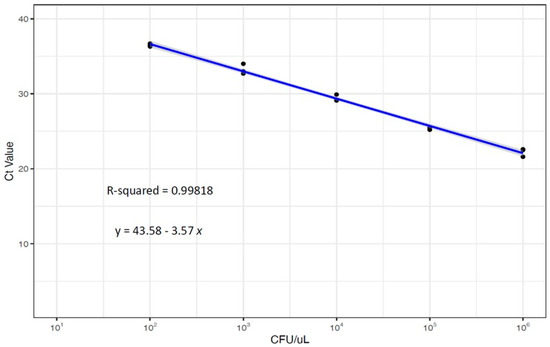 The resulting Ct values of the calibration curve were plotted using linear regression and PROBIT regression to determine the limit of detection (LOD). The results indicated that the LOD, as determined by PROBIT regression, was 266 CFU/µL (Figure 1, Table 1). Furthermore, no significant differences were observed across the triplicates, indicating a high level of test reproducibility and calibration curve reliability (R2 > 0.980). Once the LOD was estimated, we conducted tests on three dilutions below the LOD that resulted in no amplification (Figure 1; Table 1). To assess the analytical specificity of the assay, we included a diverse panel of bacteria and fungi (Table 2), and no amplification was observed for any of the panels (Table 2).