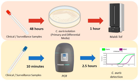 Diagnosing Candida auris infection presents challenges due to its non-specific clinical manifestations and resemblance in culture to other Candida species [11,12]. Furthermore, conventional diagnostic approaches, such as culture-based methods, are time-consuming and exhibit low sensitivity, particularly in patients with prior antifungal therapy. Matrix-assisted laser desorption/ionization time-of-flight mass spectrometry (MALDI-TOF MS) has emerged as a valuable tool for the rapid identification of C. auris [13,14], with the caveat that not all reference databases may allow for the accurate detection of C. auris species and strains from all its phylogenetic clades. Alternatively, molecular-based methods have demonstrated enhanced sensitivity and specificity in C. auris detection using polymerase chain reaction (PCR) and loop-mediated isothermal amplification (LAMP) assays, enabling direct detection of C. auris in a variety of clinical specimens such as blood, urine, respiratory secretions, or wound swabs [15,16].