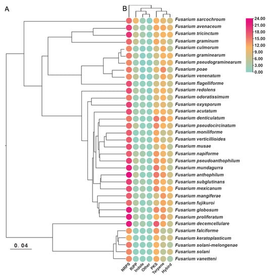 Distribution of six different types of gene clusters in 35 pathogenic Fusarium species. (A) Evolutionary relationships of the 35 pathogenic Fusarium species were constructed based on orthologous single-copy genes. (B) The BGC types were counted to visualize based on antiSMASH predictions.