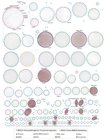 GCF network of the 1733 predicted biosynthetic gene clusters (BGCs) from 35 pathogenic Fusarium species calculated by the BiG-SCAPE pipeline and visualized with Cytoscape. The hollow triangles represent the BGCs from the MIBIG database, whose names are labeled near the corresponding hollow triangles. The network with a shaded background represents the identifiable GCFs.