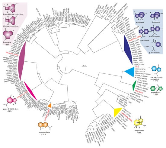 Cluster analysis of 209 sesquiterpene sequences. The identified sequences are marked in red, and groups containing identified sequences are highlighted with a colored background. The fill color of products of identified sequences corresponds to the background color of the group in which they are located.