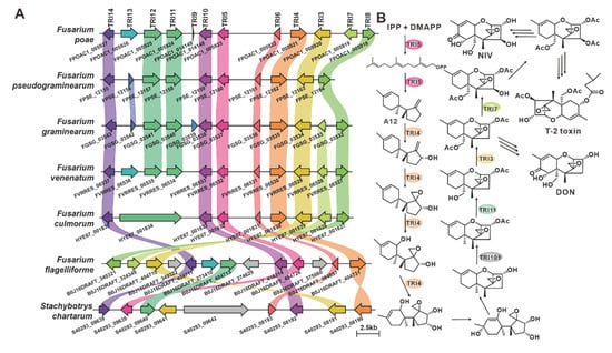 Biosynthesis of trichodiene-type analogues in pathogenic Fusarium species. (A) Comparison of triBGCs from different species: homologous genes are connected by a band of the same color. (B) Biosynthetic pathways of trichodiene-like toxins: Tri5 indicates trichodiene synthase; Tri4 and Tri11 indicate cytochrome P450 monooxygenases; Tri6 indicates regulatory protein; Tri3, Tri7 and Tri101 indicate acetyltransferases.