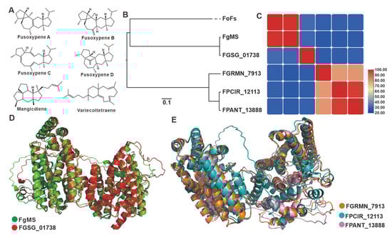 Fusarium-derived sesterterpenoids and sesterterpene synthases. (A) Structures of representative sesterterpenoids from Fusarium species. (B) Clustering analysis of chimeric sesterterpene cyclases. (C) Amino acid sequence identity analysis of chimeric sesterterpene cyclases. (D) Structural comparison of the predicted three-dimensional structures of FgMS and FGSG_01378. (E) Structural comparison of the predicted three-dimensional structures of FGRMN_7913, FPCIR_12113 and FPANT_13888.