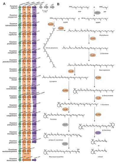 - Linnemannstons, P.; Prado, M.M.; Fernandez-Martin, R.; Tudzynski, B.; Avalos, J. A carotenoid biosynthesis gene cluster in Fusarium fujikuroi: The genes carB and carRA. Mol. Genet. Genom. 2002, 267, 593–602. [Google Scholar]