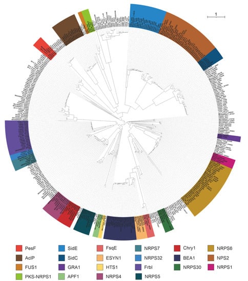 A total of 400 NRPSs were identified in the 35 selected pathogenic Fusarium species, including 22 identified NRPSs of Fusarium species. The homologues of 22 identified NRPSs were screened based on the cluster analysis of the phylogenetic tree (Figure 7).