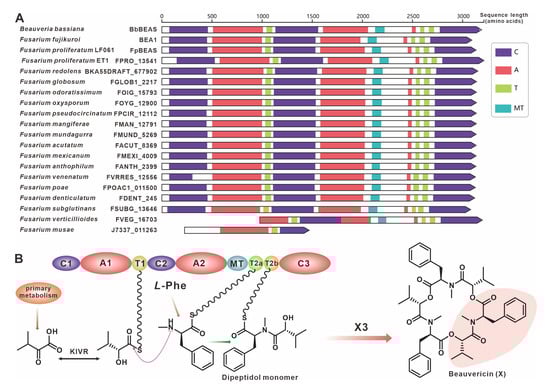 Beauvericin biosynthesis. (A) Domain comparison of BbBEAs for the biosynthesis of beauvericin: different colored regions represent different domains. (B) Model of the biosynthesis of beauvericin.