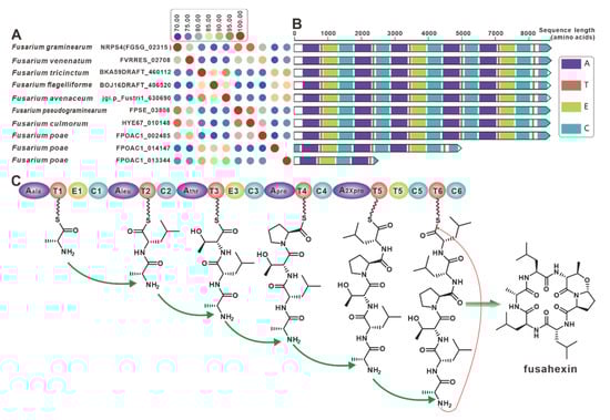 Fusahexin biosynthesis. (A) Comparison of the amino acid sequence identity of NRPS4 and its homologues. (B) Domain comparison of core genes for the biosynthesis of fusahexin: and different colored regions represent different domains. (C) Model of the biosynthesis of fusahexin.
