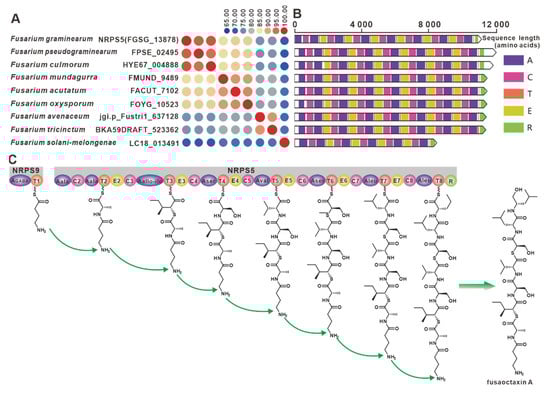 Fusaoctaxin A biosynthesis. (A) Comparison of the amino acid sequence identity of nrps9 and its homologues. (B) Domain comparison of NRPS9 for the biosynthesis of fusaoctaxin A: different colored regions represent different domains. (C) Model of the biosynthesis of fusaoctaxin A.