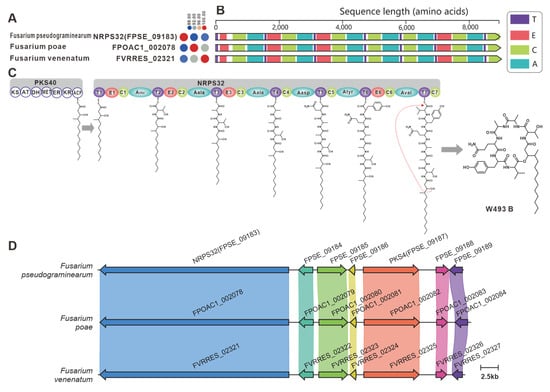 W493 B biosynthesis. (A) Comparison of the amino acid sequence identity of NRPS32 and its homologues. (B) Domain comparison of NRPS32 for the biosynthesis of W493 B: different colored regions represent different domains. (C) PKS40 and NRPS32 collaborative model of the biosynthesis of W493 B. (D) Comparison of the BGC for W493 B and two putative BGCs: homologous genes are connected by a band of the same color.