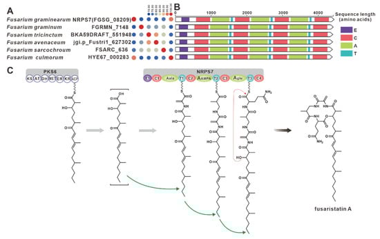 Fusaristatin A biosynthesis. (A) Comparison of the amino acid sequence identity of NRPS7 and its homologues. (B) Domain comparison of NRPS7 for the biosynthesis of fusaristatin A: different colored regions represent different structural domains. (C) PKS6 and NRPS7 collaborative model of the biosynthesis of fusaristatin A.