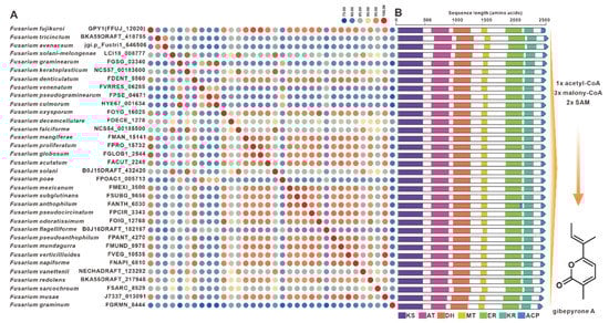Gibepyrone A biosynthesis. (A) Comparison of the amino acid sequence identity of GPY1 and its homologues. (B) Domain comparison of GPY1 for the biosynthesis of gibepyrone A: different colored regions represent different domains.