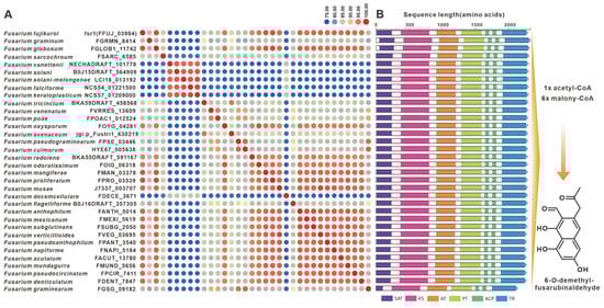 6-O-methylfusarubin biosynthesis. (A) Comparison of the amino acid sequence identity of Fsr1 and its homologues. (B) Domain comparison of Fsr1 for the biosynthesis of 6-O-methylfusarubinfusarubin: different colored regions represent different domains.