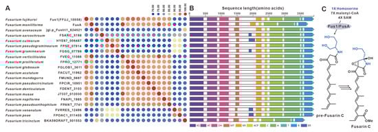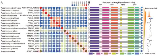 Fusaric acid biosynthesis. (A) Comparison of the amino acid sequence identity of FUB1 and its homologues. (B) Domain comparison of FUB1 for the biosynthesis of fusaric acid: different colored regions represent different domains.