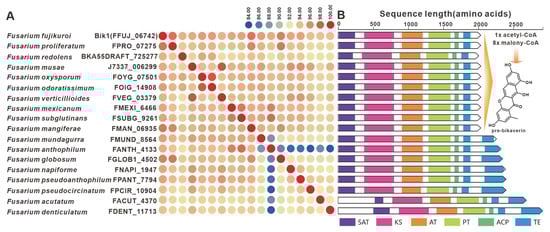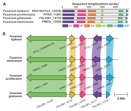 PKS6 is considered one of the pivotal genes involved in the biosynthesis of the cyclic peptide fusaristatin A []. This gene operates in conjunction with another core gene, NRPS7, to synthesize fusaristatin A (Figure 12). Five highly similar homologues of PKS6 have been identified based on both amino acid sequence identity and domain composition (Figure S36). Similarly, PKS40 and NRPS32 form another pair of synergistic core genes responsible for the production of W493 B [] (Figure 11), and two homologues of PKS40 with identical domain structures were identified (Figure S37). Furthermore, in F. fujikuroi, PKS19 serves as the core gene for the biosynthesis of α-pyrones (fujikurins). Three homologues of PKS19 have been identified in pathogenic Fusarium species, and their domain features closely resemble each other (Figure 19A). Additionally, the comparison of BGCs revealed a remarkable similarity between the presumed BGCs containing PKS19 homologues and the fujikurin BGC (Figure 19B).