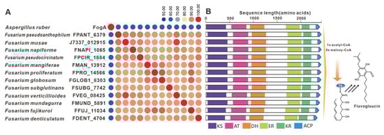 Flavoglaucin biosynthesis. (A) Comparison of the amino acid sequence identity of FogA and its homologues. (B) Domain comparison of FogA and its homologues. different colored regions represent different domains.
