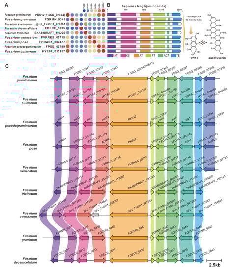 Aurofusarin biosynthesis. (A) Comparison of the amino acid sequence identity of PKS12 and its homologues. (B) Domain comparison of PKS12 and its homologues: different colored regions represent different domains. (C) Comparison of the BGC for aurofusarin and its similar BGCs: homologous genes are connected by a band of the same color.