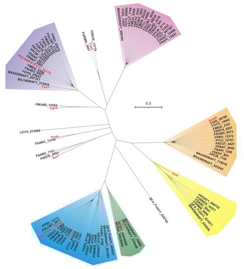The identified enzymes from Fusarium species were used as cues for cluster analysis. Clusters that fell within the same branch as the enzymes and had an identity of at least 50% were designated as independent groups. Identity assessment was performed using the percent identity matrix of the website Cluster Omega (https://www.ebi.ac.uk/Tools/msa/clustalo/, accessed on 5 July 2023).
