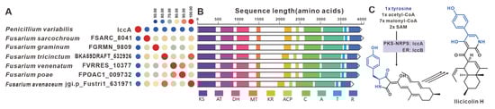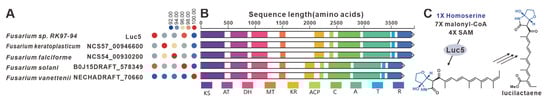 One notable example of a PKS-NRPS hybrid phytotoxin is Fusarin C, which was identified in maize infected with the plant pathogenic fungus F. moniliforme back in 1981 []. The core genes responsible for the biosynthesis of fusarin C, FusA or Fus1, were subsequently identified in F. moniliforme [] and F. fujikuroi [], respectively. Interestingly, eighteen homologues of FusA and Fus1 have been found in other pathogenic Fusarium species, and these twenty sequences make up the largest cluster of the PKS-NRPS collection. These hybrid enzymes share more than 70% of the amino acid sequence with each other (Figure 21A). Apart from five sequences that contain additional ER domains, the domain composition of the remaining sequences is consistent with that of FusA and Fus1 (Figure 21B). It is hypothesized that these homologous sequences, like FusA and Fus1, synthesize pre-Fusarin C with high homoserine, malonyl-CoA and S-adenosyl-L-methionine (SAM) as substrates (Figure 21C). Furthermore, putative FusBGCs have been discovered in eighteen additional pathogenic Fusarium species, which show significant similarity to the FusBGCs associated with the biosynthesis of Fusarin C (Figure S46). Another related compound, lucilactaene, which is a structural analogue of Fusarin C, has been isolated from Fusarium sp. RK97-94. The core gene responsible for lucilactaene biosynthesis, luc5 [], has been found in four homologues in the pathogenic Fusarium species, and these five sequences share over 92% identity (Figure 22A). Not only do their domain features bear a significant similarity to Luc5 (Figure 22B), but the BGCs containing PKS-NRPSs in these species also show high similarity to the lucBGC (Figure S47). Presumably, these homologous sequences, like Luc5, synthesize analogues of pre-Fusarin C with the same substrates as FusA and Fus1 (Figure 22C).