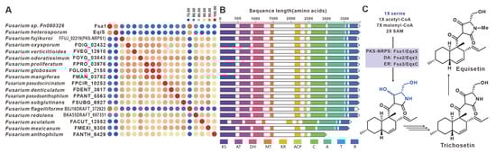 Mycotoxins, toxic secondary metabolites produced by filamentous fungi, are a threat to human and animal health, and Fusarium is a major producer of these toxins []. Almost all Fusarium species produce these harmful chemicals. For example, F. fujikuroi, a globally distributed pathogen, causes Bakanae disease in rice by producing gibberellin, which causes abnormal stem elongation in the host plant []. Several studies have shown that Fusarium is capable of producing structurally complex toxic metabolites such as terpenes (e.g., T-2 toxin [], deoxynivalenol (DON) [], fusarenone X [] and gibberellin []), polyketides (PKs, e.g., fumonisin B1 [], fusaric acid [] and zearalenone []), nonribosomal peptides (NRPs, e.g., enniatin A1 [], beauvericin [] and apicidin []) and hybrid compounds (e.g., fusarin C [], equisetin [] and (-)-sambutoxin []). These toxins not only contribute to the symptoms of plant infections but also enter the food chain and affect human and animal health, in some cases causing serious damage or even loss of life.
