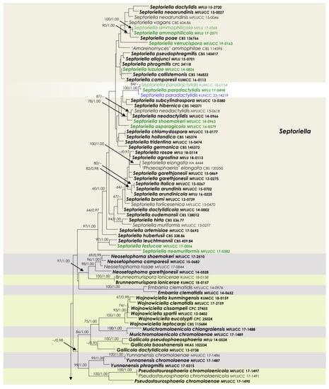 - Phookamsak, R.; Wanasinghe, D.N.; Hongsanan, S.; Phukhamsakda, C.; Huang, S.K.; Tennakoon, D.S.; Norphanphoun, C.; Camporesi, E.; Bulgakov, T.S.; Promputtha, I.; et al. Towards a natural classification of Ophiobolus and ophiobolus-like taxa; introducing three novel genera Ophiobolopsis, Paraophiobolus and Pseudoophiobolus in Phaeosphaeriaceae (Pleosporales). Fungal Divers. 2017, 87, 299–339. [Google Scholar] [CrossRef]