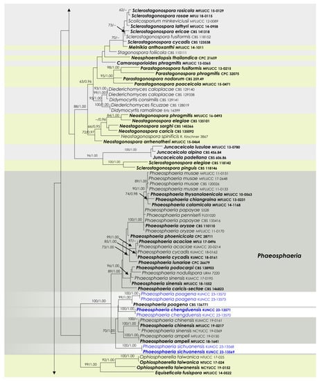 RAxML tree based on a combined dataset of partial SSU, LSU, ITS, tef1, and rpb2 DNA sequence analyses in Phaeosphaeriaceae. The bootstrap support values for ML (MLB) greater than or equal to 70% and Bayesian posterior probabilities (BYPP) greater than or equal to 0.95 are indicated as MLB/BYPP above the corresponding nodes. The newly analyzed isolates are highlighted in blue. The scale bar in the figure represents the expected number of nucleotide substitutions per site.