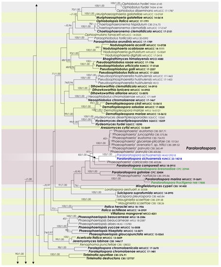 Notes: Based on the phylogenetic analysis of multiple genes, Paraloratospora sichuanensis shares a close relationship with a putatively named strain called ‘Phaeosphaeria’ caricicola (CBS 603.86). However, it is important to note that de Gruyter et al. [31] provided sequence data for CBS 603.86 without establishing a connection to any type material. In terms of morphology, Paraloratospora sichuanensis does not significantly differ from Phaeosphaeria caricicola in several aspects. Both species exhibit similar dimensions in terms of ascomata size (130–190 μm high, 120–210 μm diameter for P. sichuanensis, compared to 120–140 μm high, 120–140 μm diameter for Phaeosphaeria caricicola), asci size (55–90 × 7–14 µm for P. sichuanensis, compared to 60–70 × 6–8 µm for Phaeosphaeria caricicola), and ascospore size (20–28 × 3–5.5 µm for P. sichuanensis, compared to 15–20 × 3.5–4 µm for Phaeosphaeria caricicola) [32,33]. However, a notable difference lies in the number of septa observed in the ascospores of these two species. The ascospores of P. sichuanensis predominantly possess five septa, whereas Phaeosphaeria caricicola typically has ascospores with four septa [33]. It is worth noting that further investigation is required to establish the exact phylogenetic placement of the type of Phaeosphaeria caricicola.