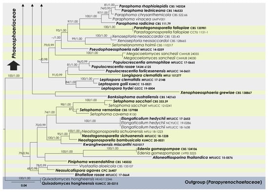 To examine the evolutionary relationships of our new strains within Phaeosphaeriaceae, we conducted phylogenetic analyses based on the combined SSU, LSU, ITS, tef1, and rpb2 DNA sequences of 258 representatives of the family. We used two strains from Quixadomyces hongheensis (Parapyrenochaetaceae) as the outgroup taxon. The full dataset consisted of 4413 characters, including gaps (SSU = 999 characters, LSU = 846, ITS1 + 5.8S + ITS2 = 663, tef1 = 871, and rpb2 = 1034). The RAxML analysis of the combined dataset yielded a best-scoring tree with a final ML optimization likelihood value of −60,293.418721. The matrix had 2211 distinct alignment patterns, with 39.5% undetermined characters or gaps. We used the GTR + I + G model of the combined amplicons for the analysis, with the following parameters: estimated base frequencies of A = 0.245652, C = 0.237255, G = 0.265783, and T = 0.251310; substitution rates of AC = 1.259144, AG = 3.770291, AT = 2.003190, CG = 0.806828, CT = 7.047351, and GT = 1.000; proportion of invariable sites I = 0.575954; and gamma distribution shape parameter α = 0.641179. The Bayesian analysis ran 40,280,000 generations before the average standard deviation for split frequencies reached below 0.01 (0.009998). The analyses generated 40,281 trees, from which we sampled 30,211 trees after discarding the first 25% as burn-in. The alignment contained a total of 2217 (SSU: 340, LSU: 325, ITS: 461, tef1: 415, and rpb2: 676) unique site patterns. Where applicable, the phylogenetic results obtained (Figure 1) are discussed in the descriptive notes below.