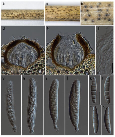 Paraloratospora sichuanensis (HKAS 129217, holotype): (a–c) ascomata on the host; (d,e) cross section of ascomata; (f) pseudoparaphyses; (g–j) asci; (j–n) ascospores. Scale bars: (d,f) 20 µm; (g,k) 10 µm (scale bar of (d) applies to (e), scale bar of (g) applies to (g–j), and scale bar of (k) applies to (k–n)).
