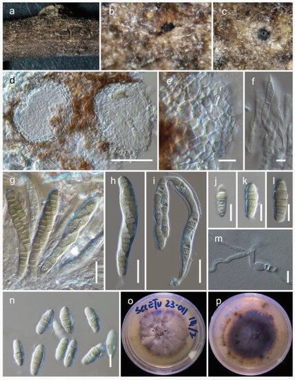 Phaeosphaeria chengduensis (HKAS 129197, holotype): (a–c) herbarium specimen; (d) vertical section through ascomata; (e) peridium; (f) pseudoparaphyses; (g–i) asci; (j–n) ascospores (m germinated spore); (o,p) colonies on PDA after 6 weeks. Scale bars: (d) 50 µm; (e,j–n) 10 µm; (f) 5 µm; (g–i) 20 µm.
